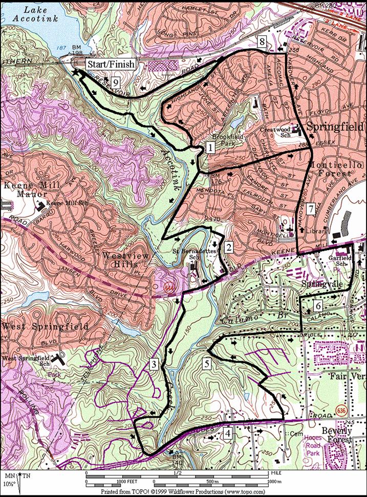 Two short options leave the woods and flood plain earlier to return through neighborhoods. After passing them, the route is under telephone lines on one segment, and along a flat pipeline for the next. After passing through Byron Avenue Park and crossing Old Keene Mill Rd., a partially paved and partially bluestone trail on the west side of Accotink Creek lets you climb to the Fairfax County Parkway Trail (FCPT). Use the FCPT to cross back to the east side of the creek and climb the long hill on the other side. Pass through some more neighborhoods, and a small paved trail back down to the Accotink Creek valley before going up a steep dirt scramble to Oriole Avenue; an awkward but short part of the route. The rest of the way is back through neighborhoods, on streets or sidewalks; roughly the same route described to drive in on.
